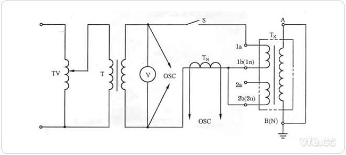 TV——調(diào)壓器;TN——測量用標(biāo)準(zhǔn)電流互感器;T——升壓變壓器;TX——被試互感器;C1、C2——電容分壓器;A\B(N)——一次繞組端子;